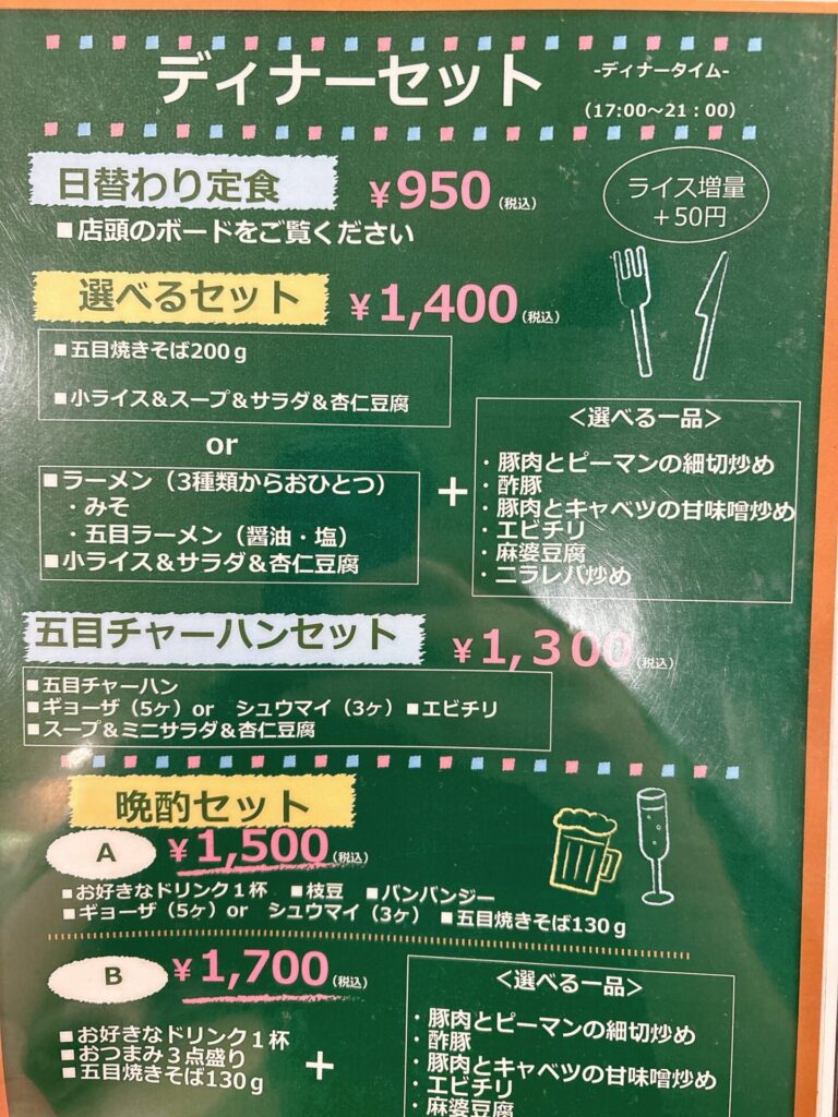 ちなみに、五目焼きそばはラーメンかを選ぶことができ、酢豚は麻婆豆腐など他の計5品の中から1品選ぶことができます。選択肢が多いのは嬉しいポイントですね!