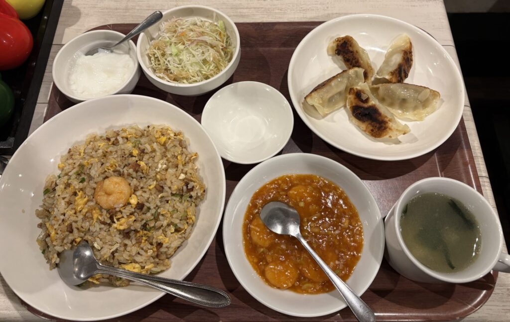 一方の五目チャーハンセットは、チャーハンにギョーザ、エビチリ、スープ、サラダ、杏仁豆腐が付いて1,300円。こちらも満足度の高い内容で、コスパの良さを実感しました。