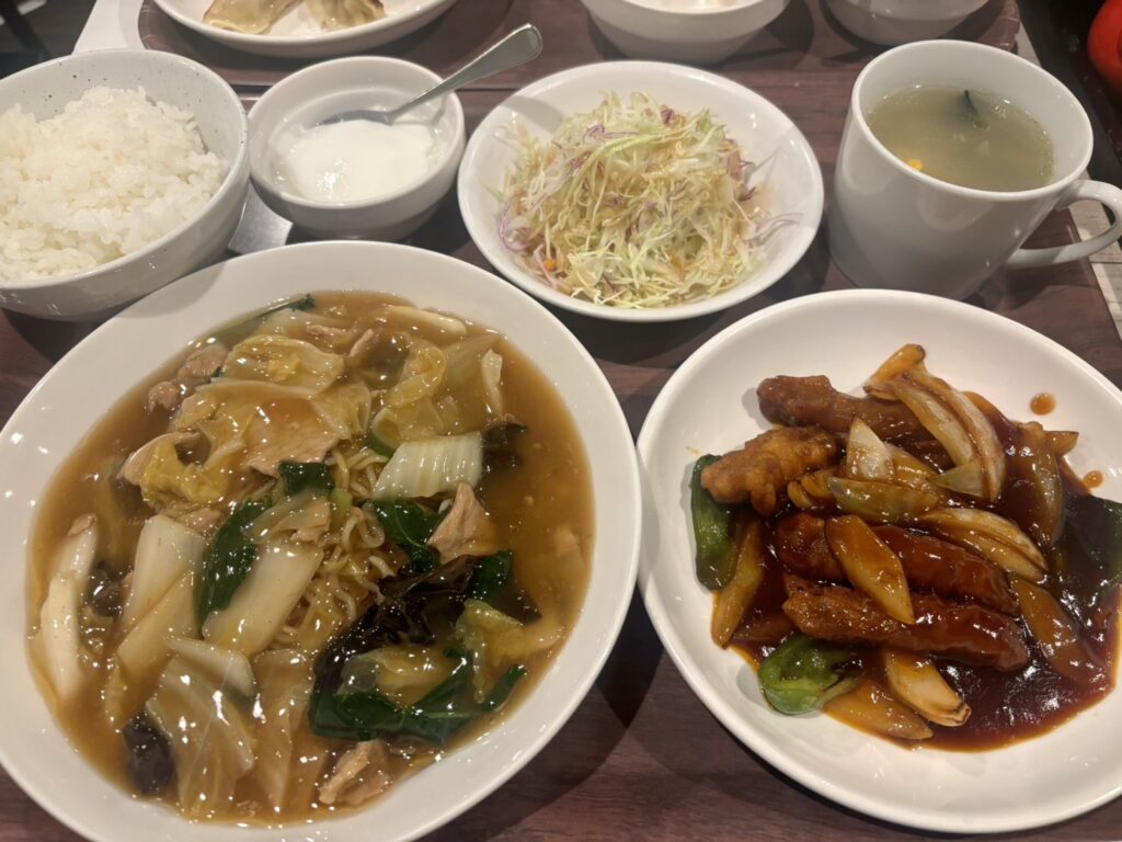 選べるセットは、五目焼きそば(あんかけ焼きそば)に小ライス、サラダ、スープ、杏仁豆腐、そして酢豚まで付いて1,400円。ボリュームがしっかりあるのにこの価格は驚きです!