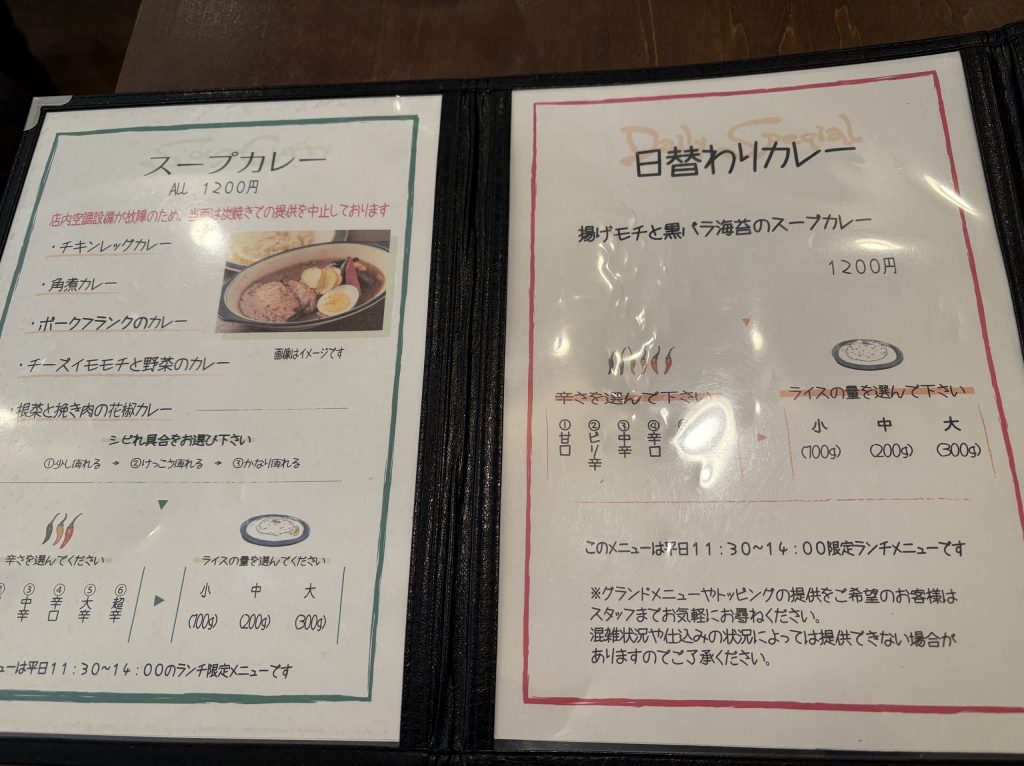 ランチタイムということで、ランチメニューが置かれていました。辛さやライスの量を無料で好みに合わせられるのは嬉しいポイントです。