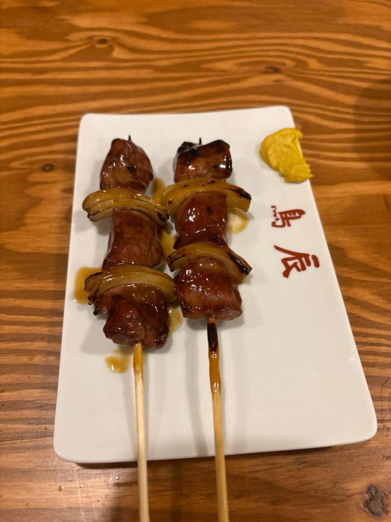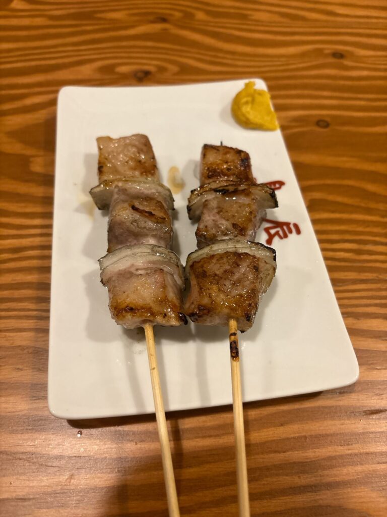 豚精肉はボリューム満点で、噛むたびに豚の甘い脂がジュワッと染み出す贅沢串です。