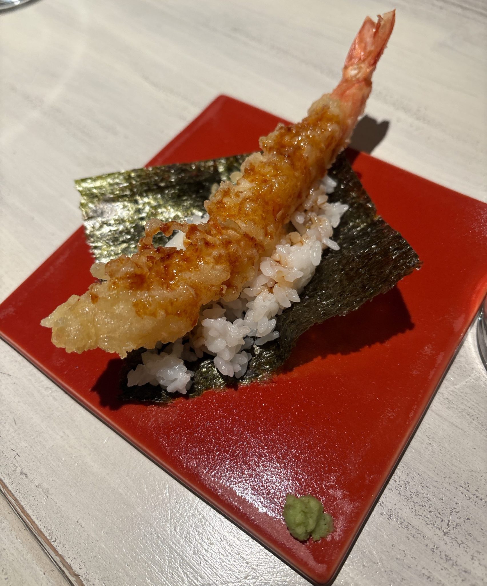 天ぷらの代表ともいえる海老の天ぷらを手巻き風にして、わさびをちょびっとつけて食べると絶品でした!