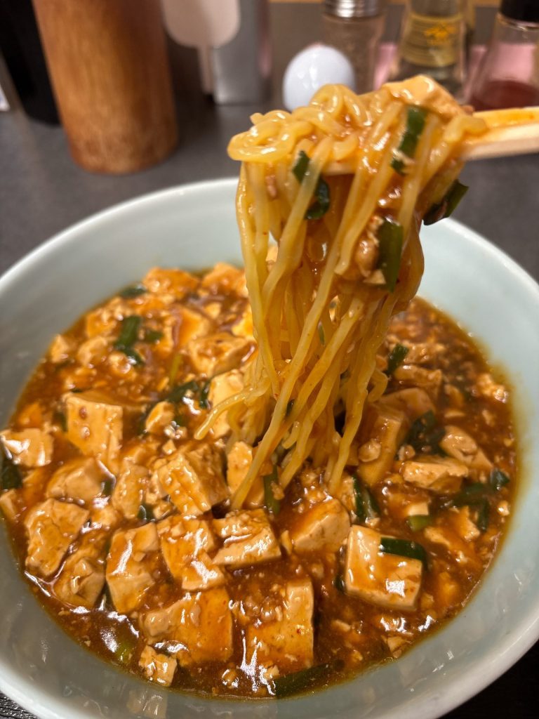 ピリ辛の麻婆ともちもち麺がよく絡み、スープなしでも満足感があります。