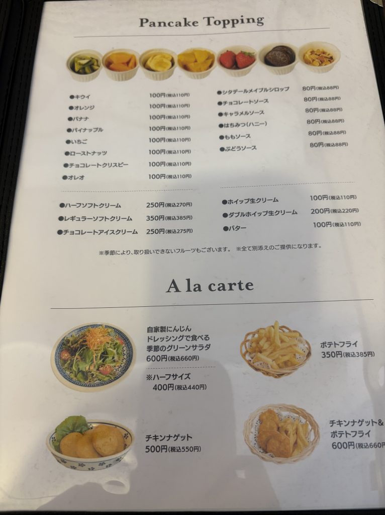 今回はパンケーキ目的での入店でしたのでパンケーキを注文したのですが、フルーツやソースのトッピングも数多くあり、好みに合わせてカスタマイズできるのも嬉しいですね♪