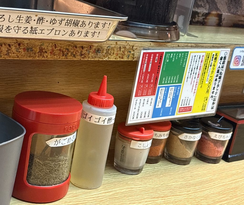 卓上には「がごめさん(昆布)」や「ゴイゴイ酢」など、ユニークな名前の調味料が並んでいて、遊び心も感じられます。